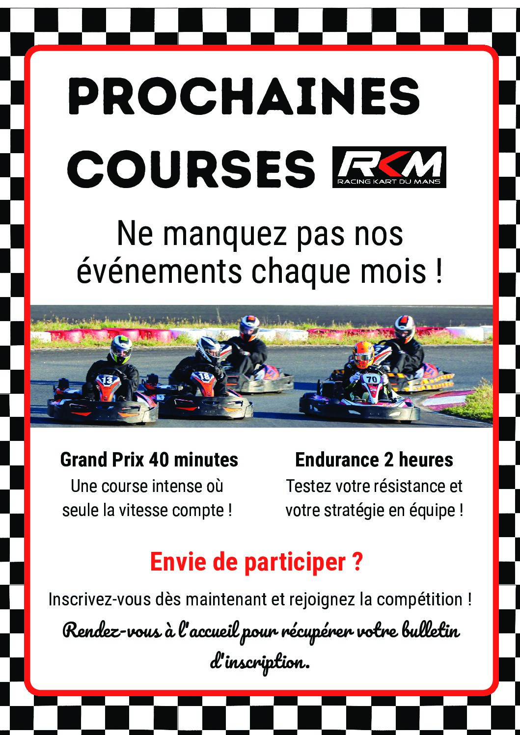Racing Kart du Mans – Les Vinettes – 72 450 Montfort Le Gesnois – Tél : 02 43 54 03 03 – Mail : contact@racingkartdumans.com